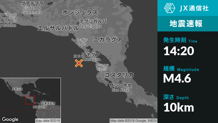 11月10日 14:20頃、ニカラグアのMasachapaから南西80kmの地点でM4.6の地震がありました。