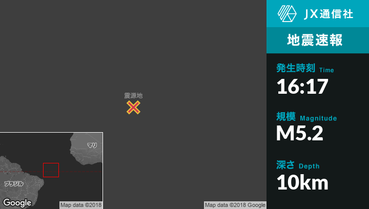 11月10日 16:17頃、ブラジルのFernando de Noronha (Distrito Estadual)から北北東591kmの地点でM5.2の地震がありました。