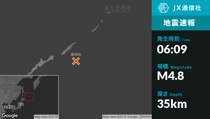 11月14日 06:09頃、ロシアのKuril'skから東208kmの地点でM4.8の地震がありました。