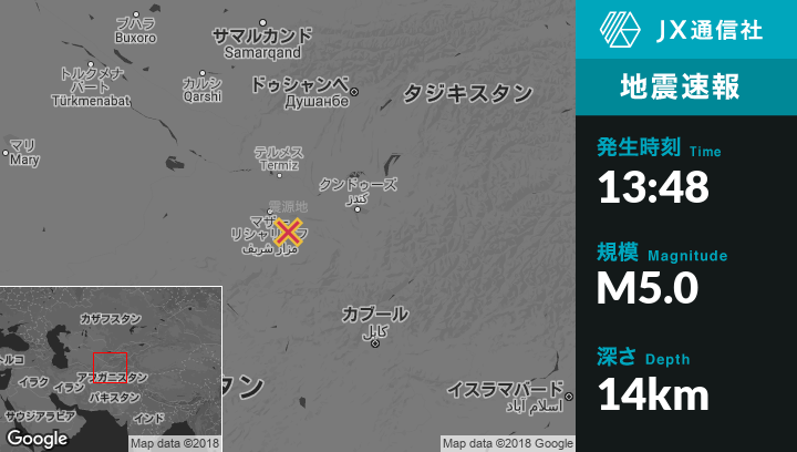 11月16日 13:48頃、アフガニスタンのKhulmから南西33kmの地点でM5.0の地震がありました。