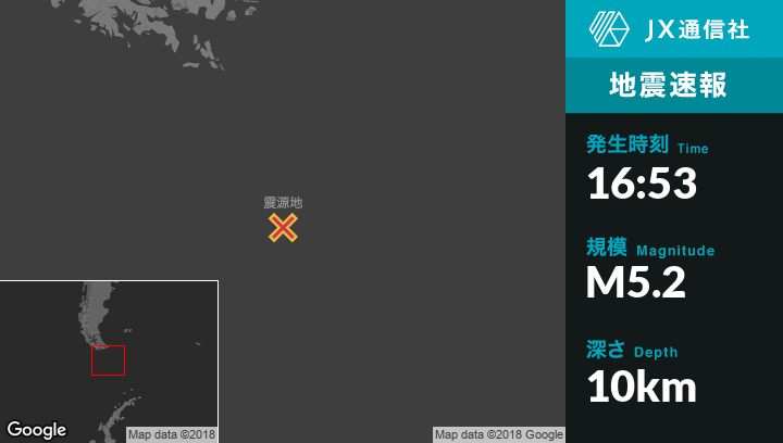 11月16日 16:53頃、アルゼンチンのUshuaiaから南南東344kmの地点でM5.2の地震がありました。