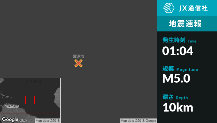 11月19日 01:04頃、フランス領ギアナのRemire-Montjolyから北東1364kmの地点でM5.0の地震がありました。