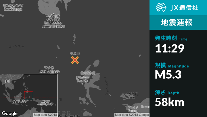 | 震源地 | インドネシアのTobeloから北西170kmの地点 |