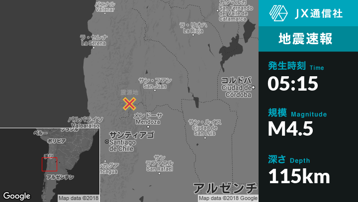 11月23日 05:15頃、アルゼンチンのCalingastaから南南西72kmの地点でM4.5の地震がありました。
