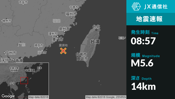 11月26日 08:57頃、台湾のMa-kungから西102kmの地点でM5.6の地震がありました。