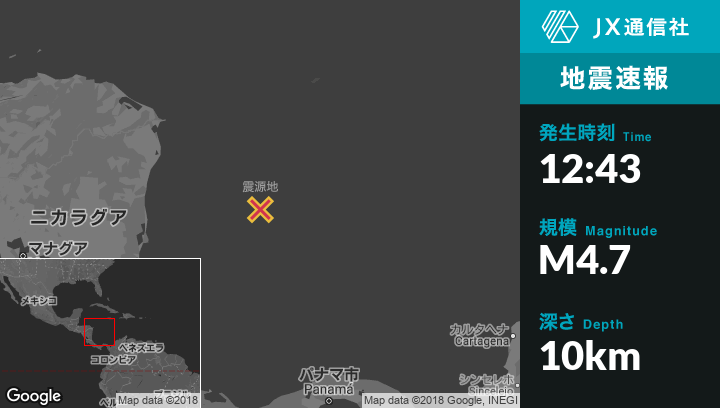 11月26日 12:43頃、コロンビアのMountainから東南東39kmの地点でM4.7の地震がありました。