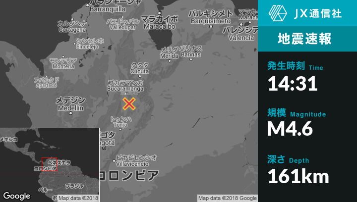 | 震源地 | コロンビアのAratocaから北北東11kmの地点 |