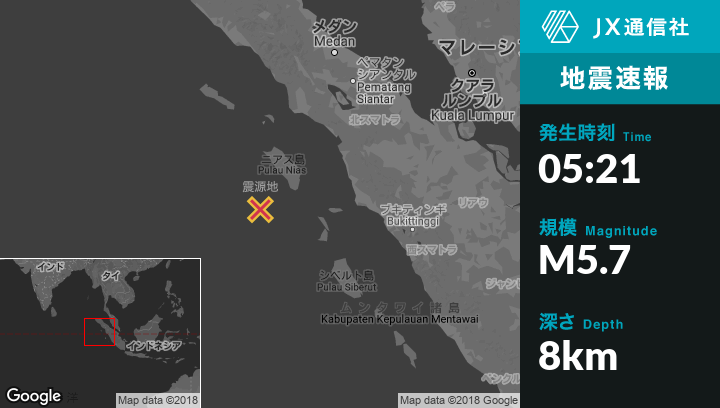 | 震源地 | インドネシアのSibolgaから南西253kmの地点 |