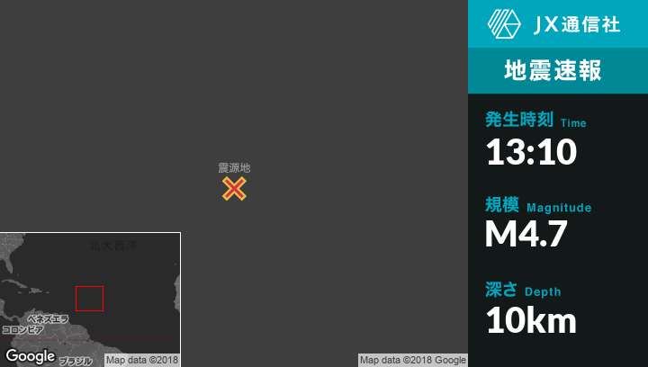 12月03日 13:10頃、バルバドスのBathshebaから東北東1064kmの地点でM4.7の地震がありました。
