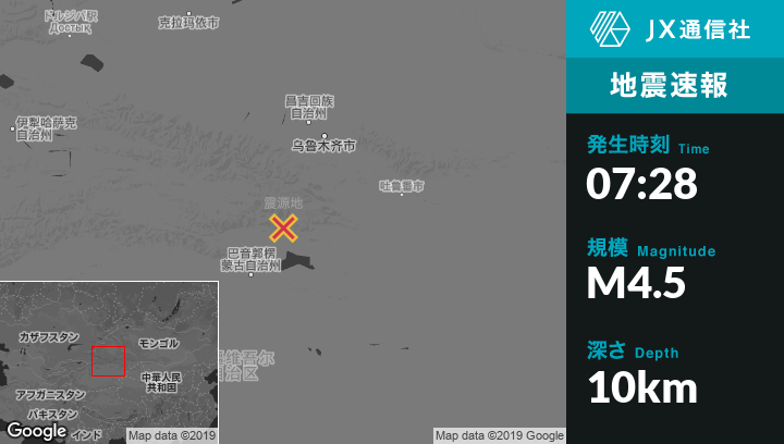 3月05日 07:28頃、中国のYanqiから北北東57kmの地点でM4.5の地震がありました。