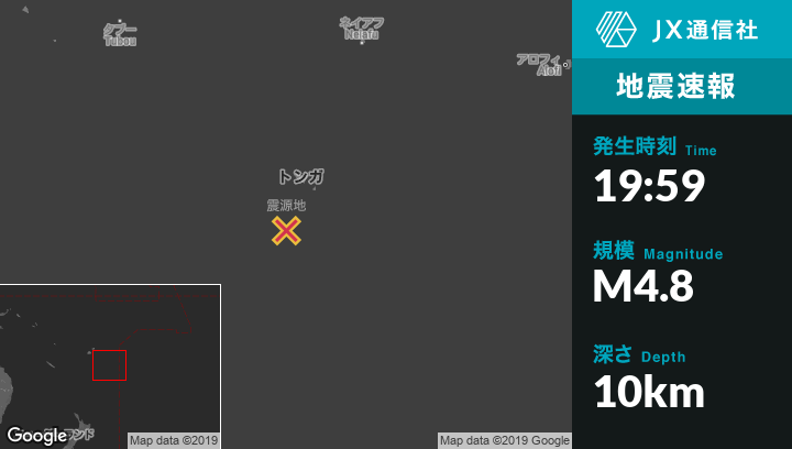 | 震源地 | トンガの`Ohonuaから南西96kmの地点 |