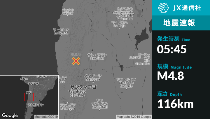 3月10日 05:45頃、アルゼンチンのCalingastaから西70kmの地点でM4.8の地震がありました。