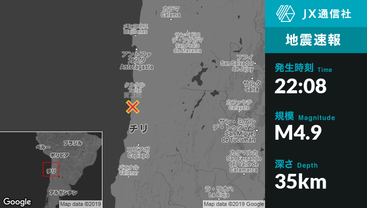3月10日 22:08頃、チリのTaltalから南南西43kmの地点でM4.9の地震がありました。