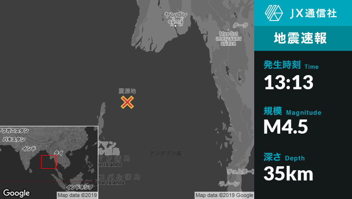 3月16日 13:13頃、インドのBamboo Flatから北北東260kmの地点でM4.5の地震がありました。