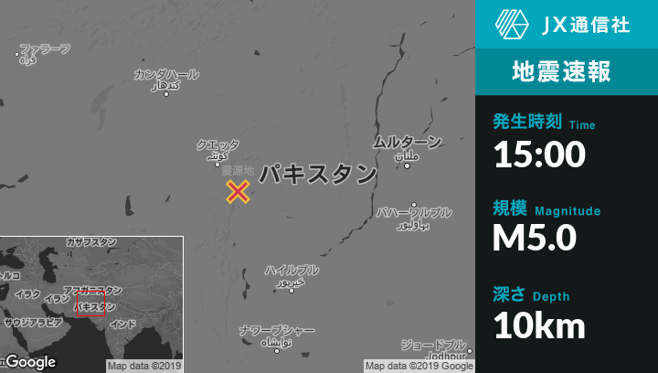 3月16日 15:00頃、パキスタンのMachから南東19kmの地点でM5.0の地震がありました。