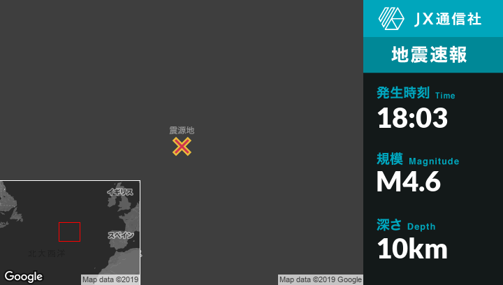 3月17日 18:03頃、ポルトガルのSanta Cruz das Floresから北北東399kmの地点でM4.6の地震がありました。