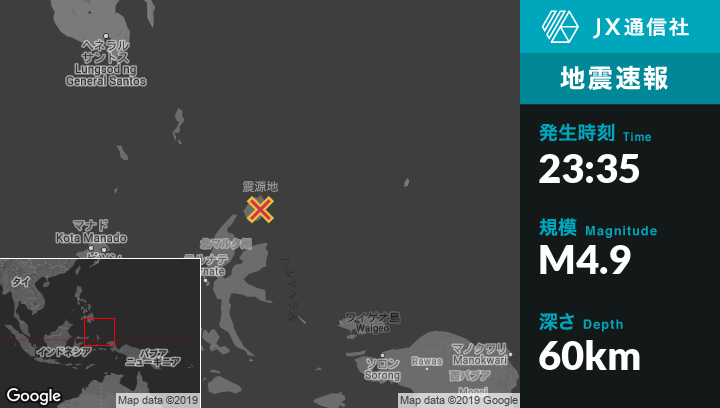 3月19日 23:35頃、インドネシアのTobeloから北東99kmの地点でM4.9の地震がありました。