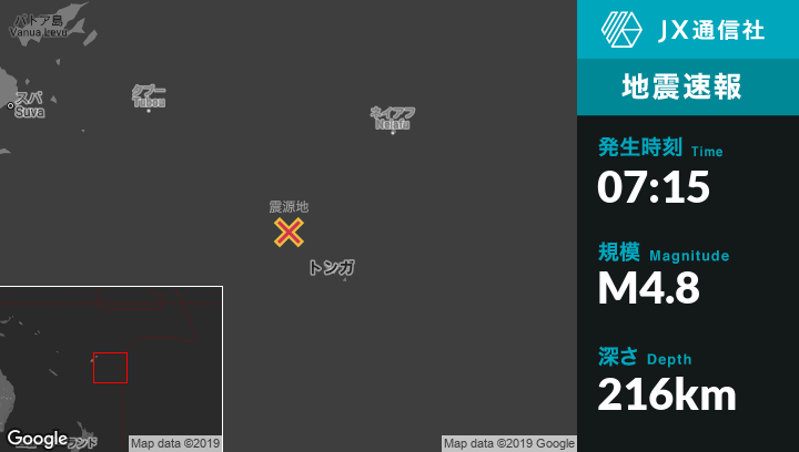 | 震源地 | トンガのNuku`alofaから北西121kmの地点 |