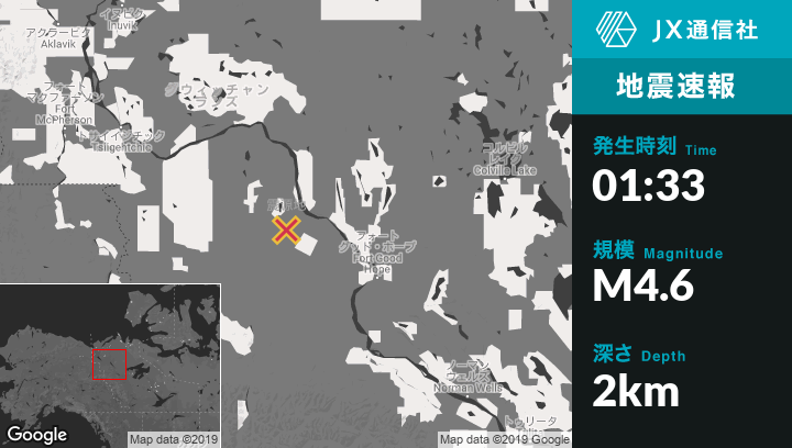 震源地カナダのFort Good Hopeから西北西93kmの地点