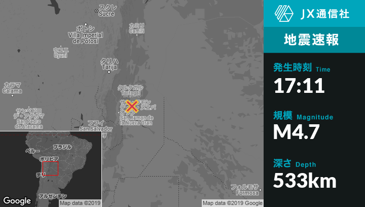 | 震源地 | アルゼンチンのGeneral Enrique Mosconiから南南東21kmの地点 |