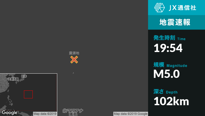 3月23日 19:54頃、北マリアナ諸島のAgrihanから北北東50kmの地点でM5.0の地震がありました。