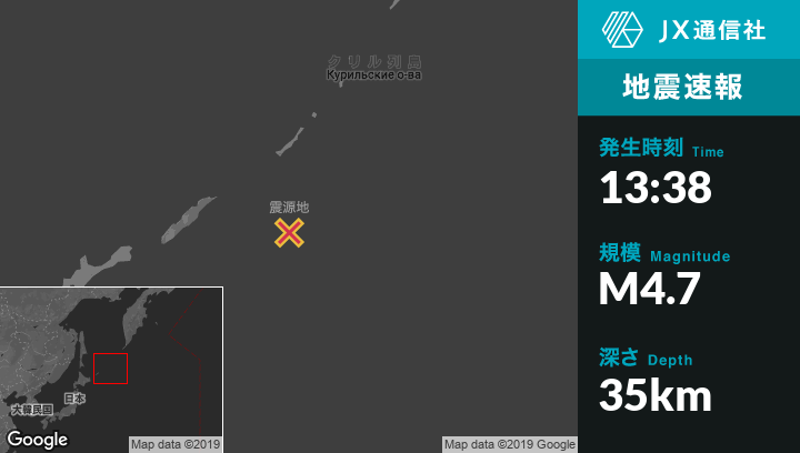 3月24日 13:38頃、ロシアのKuril'skから東北東327kmの地点でM4.7の地震がありました。