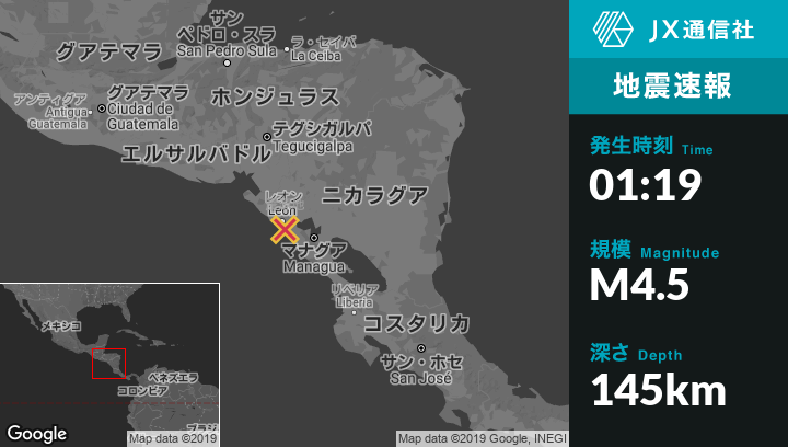 3月25日 01:19頃、ニカラグアのLeonから南東8kmの地点でM4.5の地震がありました。