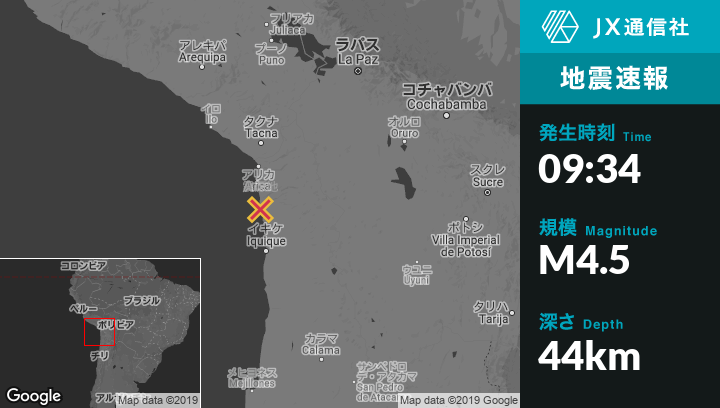 3月27日 09:34頃、チリのAricaから南88kmの地点でM4.5の地震がありました。
