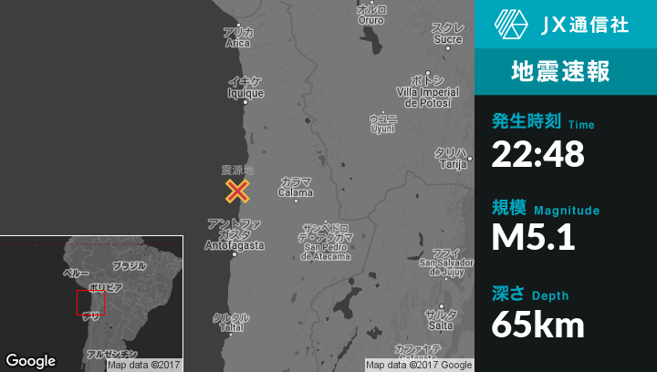 6月08日 22:48頃、チリのTocopillaから西南西13kmの地点でM5.1の地震がありました。
