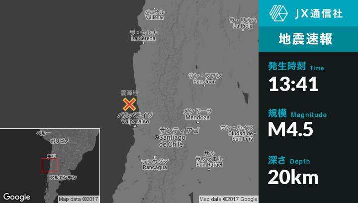 6月18日 13:41頃、チリのLa Liguaから西北西70kmの地点でM4.5の地震がありました。