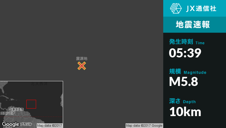 10月04日 05:39頃、フランス領ギアナのSinnamaryから北北東970kmの地点でM5.8の地震がありました。