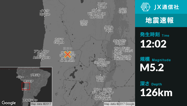 | 震源地 | チリのSan Pedro de Atacamaから南21kmの地点 |
