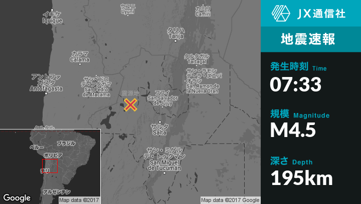 | 震源地 | アルゼンチンのSan Antonio de los Cobresから西北西47kmの地点 |