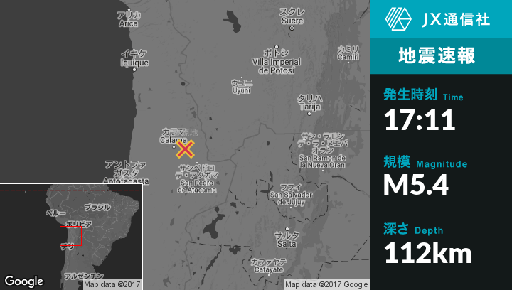 10月05日 17:11頃、チリのCalamaから東37kmの地点でM5.4の地震がありました。