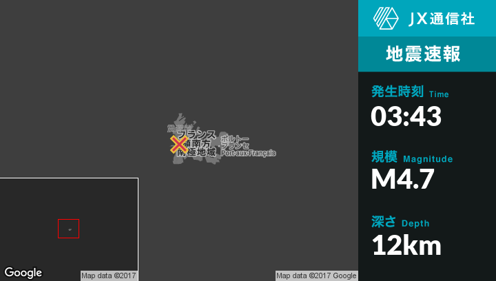 | 震源地 | フランス南部準州のPort-aux-Francaisから西93kmの地点 |