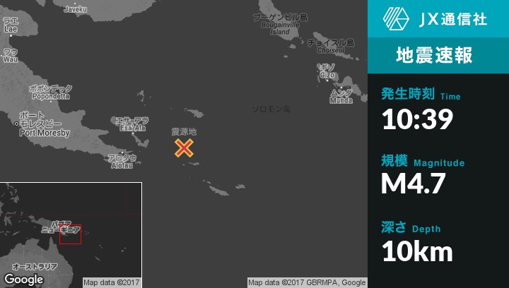 10月09日 10:39頃、パプアニューギニアのKulumadauから南南西116kmの地点でM4.7の地震がありました。