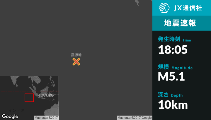 10月09日 18:05頃、ココス諸島のWest Islandから北北西543kmの地点でM5.1の地震がありました。