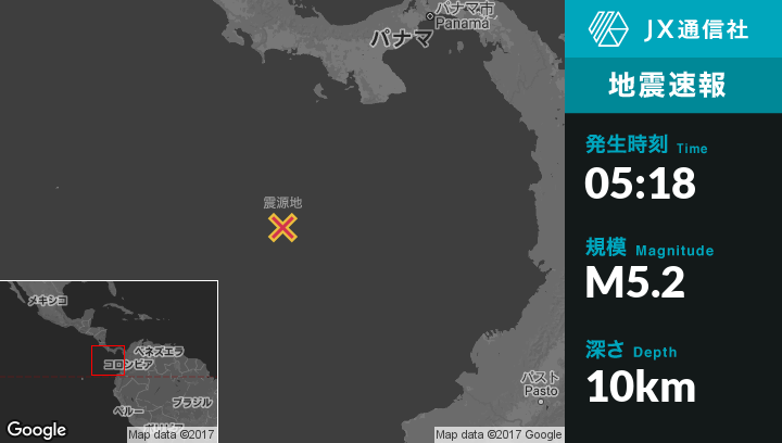 11月17日 05:18頃、パナマのPunta de Buricaから南353kmの地点でM5.2の地震がありました。