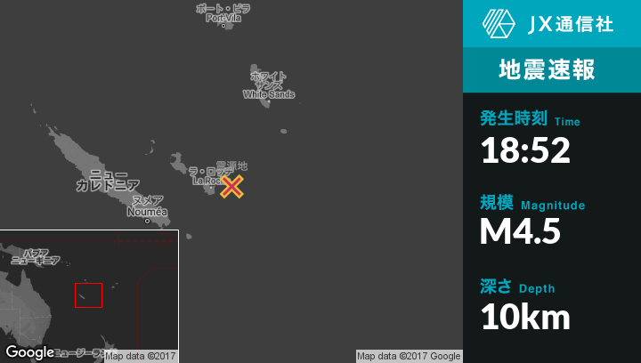| 震源地 | ニューカレドニアのTadineから東北東69kmの地点 |