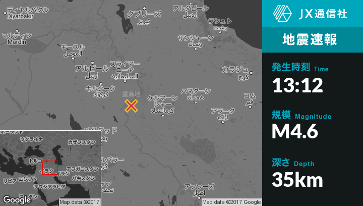 11月18日 13:12頃、イランのSarpol-e Zahabから北北西38kmの地点でM4.6の地震がありました。