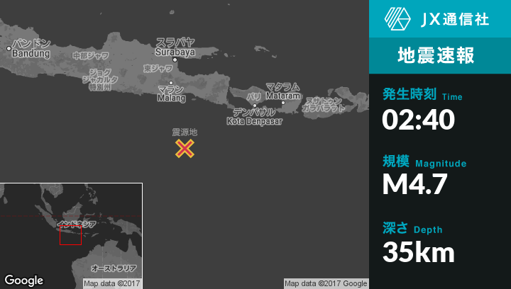 震源地インドネシアのKrajan Tambakrejoから南南東164kmの地点