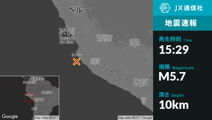 11月29日 15:29頃、ペルーのParacasから南67kmの地点でM5.7の地震がありました。