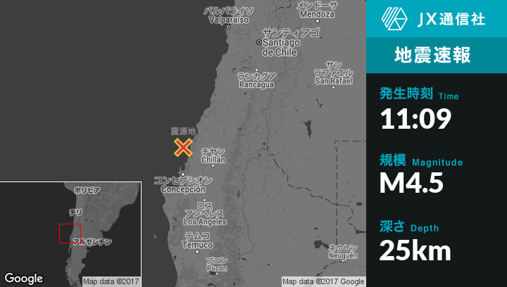 12月10日 11:09頃、チリのTomeから北62kmの地点でM4.5の地震がありました。