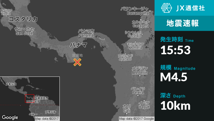 12月17日 15:53頃、パナマのPedasiから南西22kmの地点でM4.5の地震がありました。