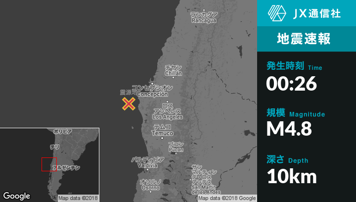 1月27日 00:26頃、チリのLebuから西北西44kmの地点でM4.8の地震がありました。