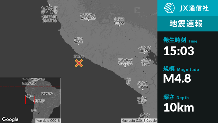 | 震源地 | ペルーのAcariから南南西73kmの地点 |