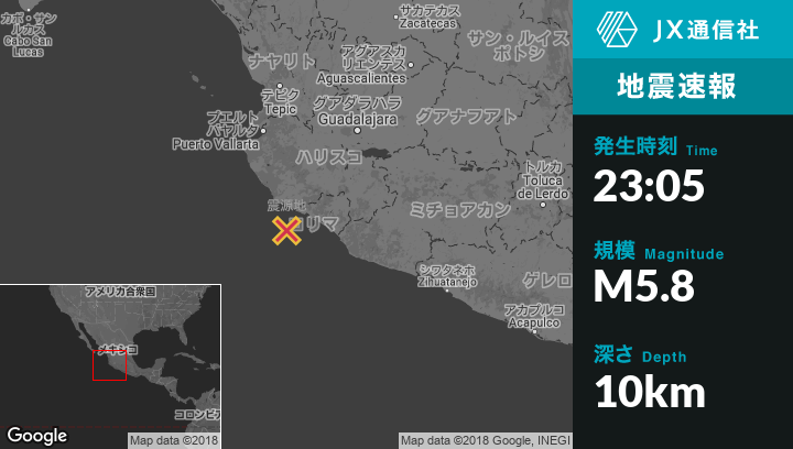 | 震源地 | メキシコのSan Patricioから南南西37kmの地点 |