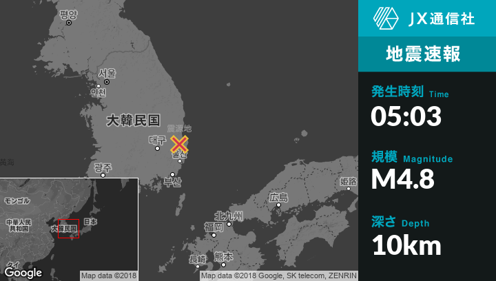 2月11日 05:03頃、韓国のHokoから北西7kmの地点でM4.8の地震がありました。
