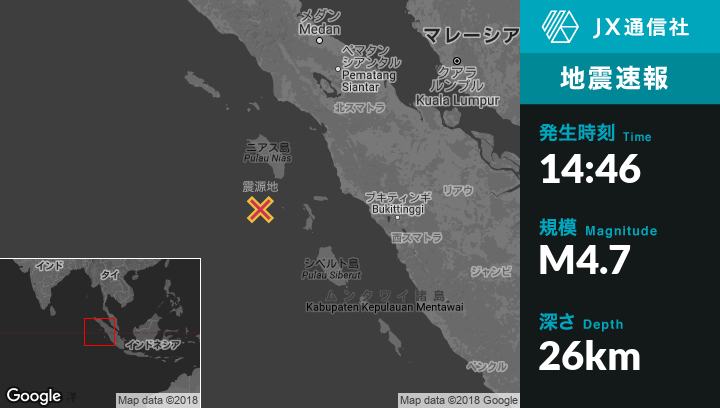 | 震源地 | インドネシアのSikabaluanから北西219kmの地点 |