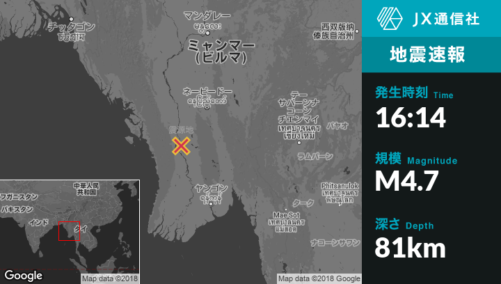 2月14日 16:14頃、ミャンマーのPromeから南南東10kmの地点でM4.7の地震がありました。
